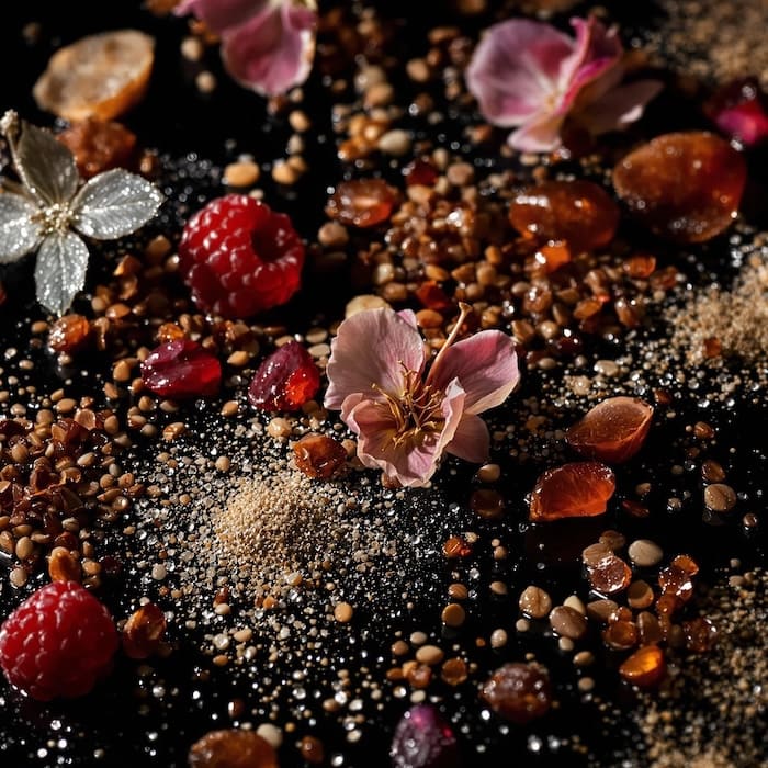 A seductive and mysterious scent with notes of Crushed Raspberry Seed, Wild Honeysuckle, Jasmine, Amber, and Caramelized Praline.