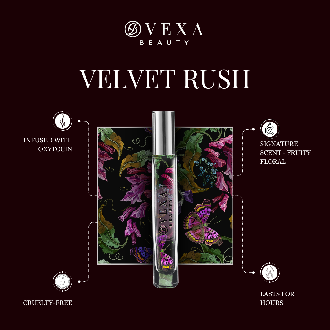 Escape the ordinary with an exotic mix of lush fruity, floral and gourmand scents. Velvet Rush opens with a fresh burst of Pomelo and Bergamot, while juicy Plum adds a touch of sweetness. The floral heart of Turkish Rose and Jasmine followed by Amber, Musk, and Vanilla in the base wrap you in a warm hug keeping you smelling amazing all day long. And it’s infused with Oxytocin, the “feel good” peptide, which can help boost your mood and confidence. Enjoy the rush 😉